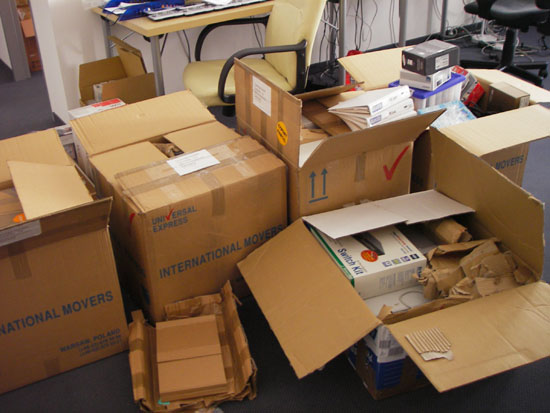 Ich kam ins Büro und es standen überall Kisten herum. Heute kamen x Sendungen zugleich. Einmal 2 Wiis + 3 DS-X Module. Dann 6 Pakete aus Polen mit den Überresten aus meinem Unternehmensversuch dort. Viele Handies und PCs. Zu guter Letzt noch ein neuer PC und eine neue Digitalcamera.