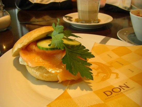 Im DON hatte ich einen Cappuccino und ’nen Lachs-bagel zum Frühstück. Danach noch einen Erdbeer-Shake. Wir quatschten gut 2 Stunden – schnell war es 14:30.