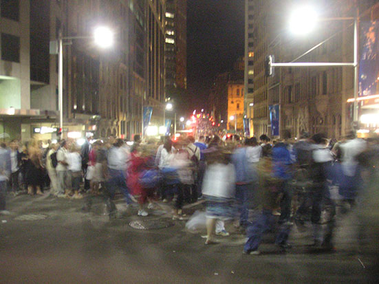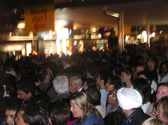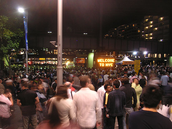 Nach dem Spektakel schienen wieder Hunderttausende auf dem Weg. Ich spazierte zum Darling Harbour. Da genemigte ich mir ein erstes Eis und ’nen Red Bull zum Start des Jahres. In Cockle Bay, wo ich gestern mein Ticket abholte, wollte ich dann feiern. Da fand ich heraus, dass die Party ganz woanders ist. Na sowas! Nach ’ner Weile bekam ich endlich ein freies Taxi. Das brachte mich an die richtige Stelle am anderen Ende der Stadt. So viele Leute auf den Straßen…Wahnsinn!