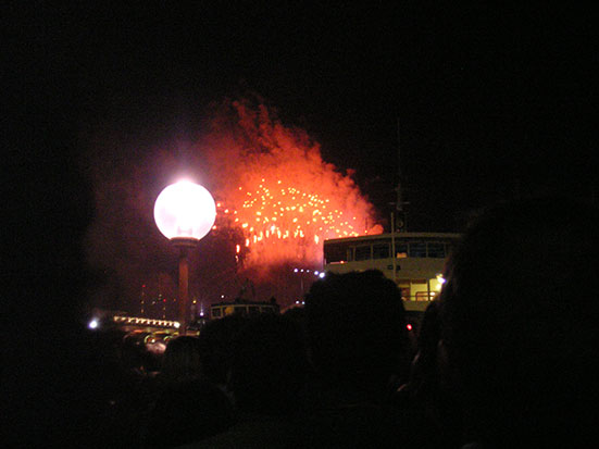 Gegen 23:00 schwang ich mich zum Hafen. Natürlich strömten alle dorthin. Die beste Aussicht von der Oper war ausverkauft also suchte ich mir einen Platz am Pier. Gegen 23:20 waren bereits unglaublich viele Leute dort. Überall wurde gedrückt. Nach kurzer Zeit ging es in einfach keine Richtung mehr. Jeder blieb wo er war. Ich sah mehr als die Hälfte der Harbour Bridge, also war das doch ganz OK. In dieser Presse und nach mehreren Druckwellen in der Menschenmasse, wurde ein 5 Sekunden Countdown auf die Brücke projeziert und dann war es da: