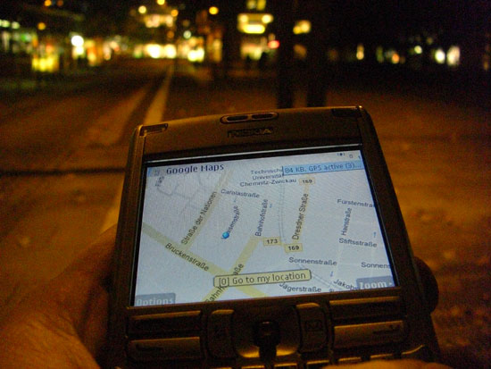 19:30 war ich auf dem Weg zur Gallerie „Roter Turm“. Mein GPS dabei checkte ich die neue Version von Google Maps für S60. Dank Bluetooth Verbindung sah ich meinen Punkt auf der Karte. Die Karte über UMTS, die Koordinaten von der GPS Mouse. Sehr genial. GPS wird immer wichtiger, wenn auch Mac OS 10.5 geocoding unterstützt.