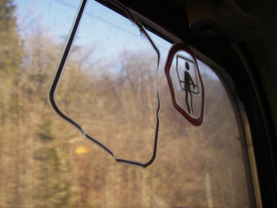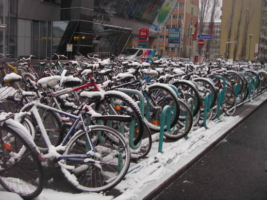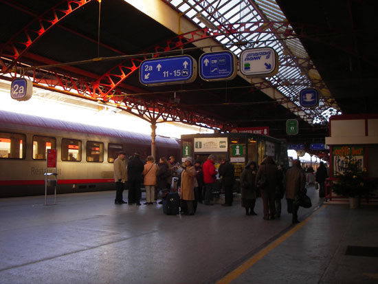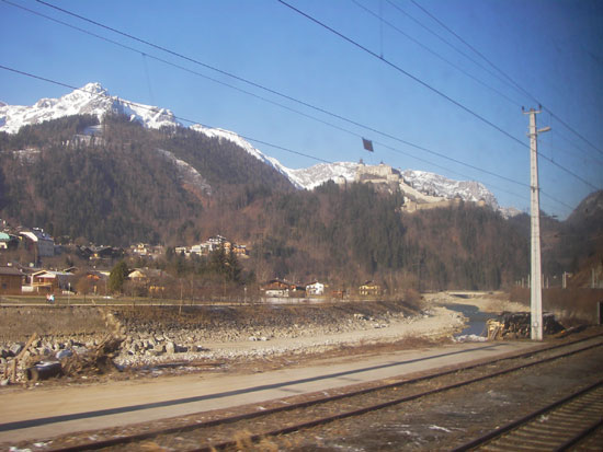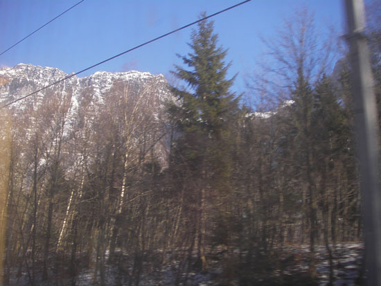 Der Zug nach Graz war sehr voll. Ganz vorne fand ich ’nen guten Sitzplatz. iPod an und los ging’s. Heute mit schönem Wetter sah die Winterlandschaft draußen sehr schön aus. Es ging durch die Berge mit verschneiten Baumhängen. In vielen Orten stiegen Skiurlauber zu und aus.