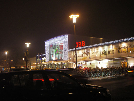 Mit etwas Verspätung in der Dunkelheit kam der Zug gegen 15:30 in Graz an. Das ibis-Hotel war gleich neben dem Bahnhof, da brauchte ich gar nicht suchen. Meine Reservierung hatte geklappt. Entgegen der Web-Auskunft waren für morgen doch noch ein paar wenige Zimmer verfügbar — nur eben zum normalen €62 Preis.