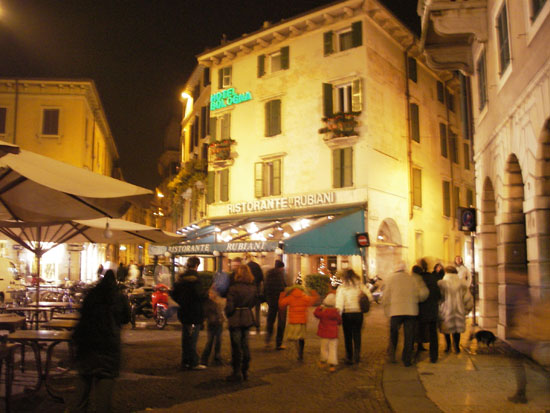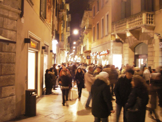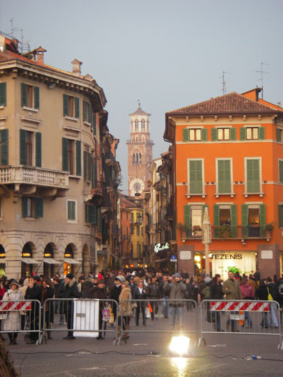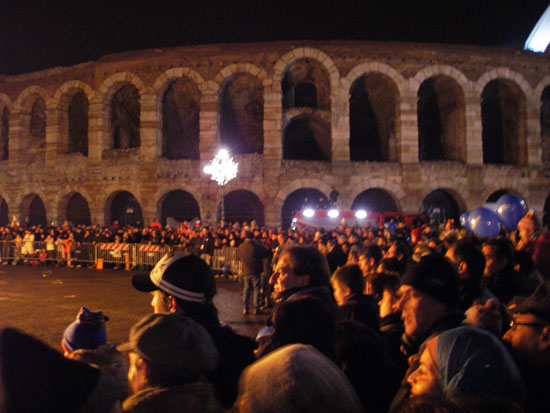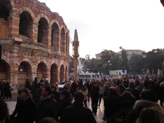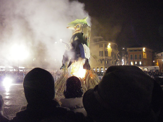Auf dem Piazza Brá, neben einem kleinen Colloseum, war eine große Hexe aus Stroh und Holz aufgebaut. Die wurde sicher später angezündet – ich reimte mir das auf 18:00 zusammen. Weiter umherschlendernd aß ich einen Zuckerfladen. Halb 6 gab’s eine kleine Theateraufführung mit Feuerwerk auf dem Amphitheater. Ich bezog Position für die Hexenverbrennung. Ein Moderator interviewte einige Leute, dann wurde ein Countdown gezählt. Die Bambini mussten was schreien, dann brannte die Hexe.