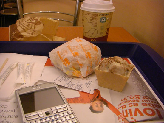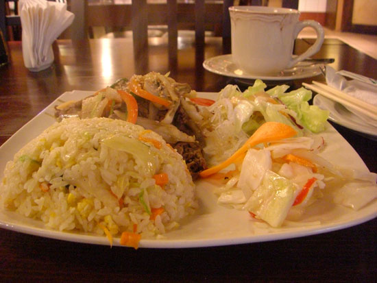 Meinen Rucksack verstaute ich und ging erst mal zu McDonalds frühstücken. Es gab ’nen großen Cappuccino mit einem kleinen Kuchen und Cheeseburger. Gut gestärkt hatte ich nichts besseres zu tun als bei Schneeregen das nächste Essen zu planen. Ich wollte zum Japanisch/Koreanischen Restaurant in Uni Nähe. Eine Runde um den Block und so aß ich da auch wieder Beef mit Reis. Dieses Mal gab’s nur eine Tasse Tee, statt einer ganzen Kanne.