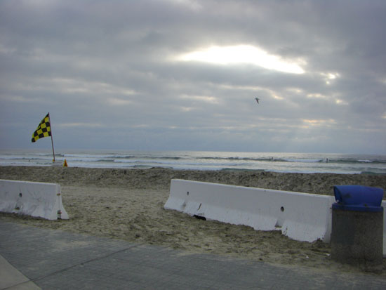 Dann wartete ich eine halbe Stunde auf den Bus #30, der direkt nach Pacific Beach fährt. Gegen 5 war ich dann im Hostel; Banana Bungalows. Sehr easy going – so in etwas stellte ich mir das auch vor. Es liegt perfekt am Strand. Von meinem Bett aus kann ich direkt auf den Ozean schauen.