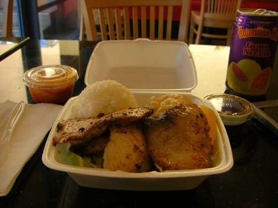 Zum Frühstück hatte ich meine Flakes mit Banane. Dann legte ich mich etwas an den Strand und hörte iPod. Es war windisch und frisch aber die Sonne schien supertoll. Mittags ging ich zum L & L Hawaiian Barbeque und hatte ein super kleines Essen.
