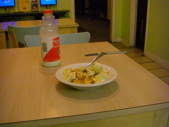 Dusche und zum Frühstück. Meine Milch und mein Müsli schmeckten mit ’ner Banane. Ich stopfte mir die Sache schnell in den Magen, die Uhrzeit näherte sich 5:45, der offiziellen Abholzeit.