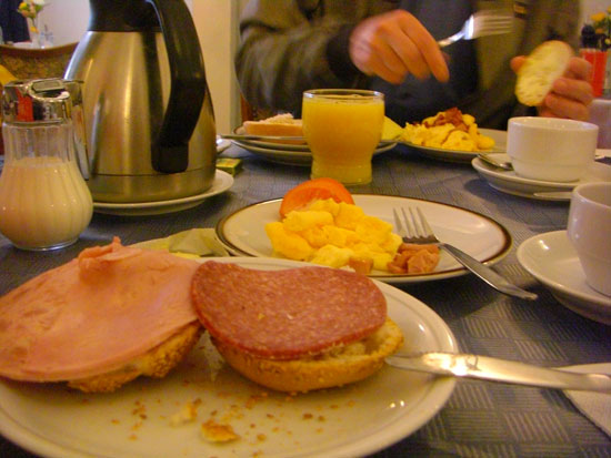 Mir wurde das Hemd gebügelt, ich packte meine Sachen zusammen. Wir gingen runter zum Frühstück. Da wir nicht bezahlt hatten, schrieb er die €10.50 pro Nase an. Ich aß ein paar Brötchen mit Ei. Alles sehr gut und voll zufrieden. Die Uhr tickte gegen 10, wir checkten aus, hatten aber noch etwas Zeit für den kurzen Fußweg zum Publisher. So saß ich nochmal im Auto.