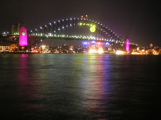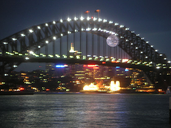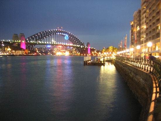 Bevor mein Kopf explodierte, fuhre ich runter an den Hafen. Es ist wieder sehr schwül. Die Gedanken schwirrten immer noch unkontrollierbar durch den Kopf. Die schön blinkende Harbour Bridge brachte jedoch Abwechslung. Es wurde dunkel. Die Lauflichter, den augenblicklichen Kunstwerks sehen fantastisch aus. Die Lichtfarbe auf den hängenden Globus ändert sich ständig. Mit der Oper daneben ist das einer der eindruckvollsten Orte, die ich kenne.