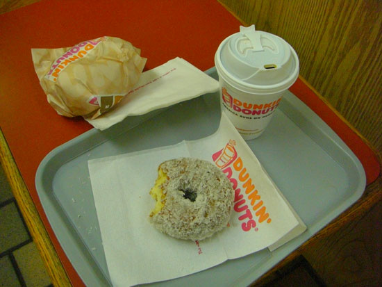 Ich kam nach 12 aus Brooklyn zurück, ging kurz ins Netz und machte mich nachmittags auf die Socken. Zuerst holte ich ein zweites Frühstück und das Mittagessen bei Dunkin Donut nach. Wieder mal das Omlette Supreme – dieses Mal jedoch auf ’nem Bagel statt Croissant und zusätzlich ein Coconut Donut.