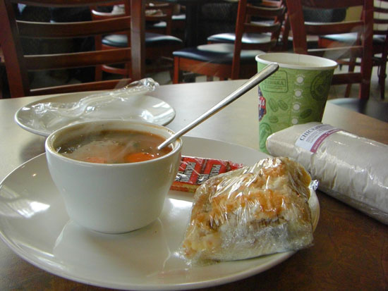 Ich checkte recht pünktlich aus und ging erst mal im altbekannten Café Frühstücken. Dieses Mal die Combo 4 mit Chicken Wrap und ’nen extra Kuchen.