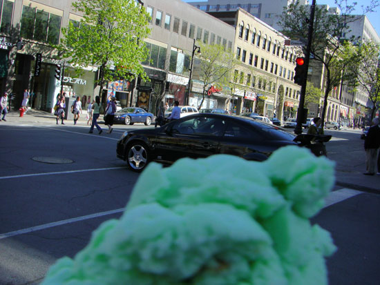 Der Victoria-Platz ehrt die Königin, die hier in Quebec nicht so beliebt ist. Am Montag ist dennoch Feiertag. Weiter ins Touristenzentrum und immer weiter. Dann setzte ich mich in ein Restaurant, hatte eine „Gondola“ mit Shrimp und Orangensaft. Sehr gutes Essen. Auf der gegenüberligenden Straßenseite gab’s ein Pistazien-Eis als Nachtisch.