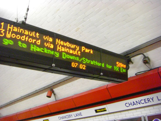 Die Anzeige für den nächsten Zug sagte irgendwas, dass die Liverpool Station geschlossen sei und man irgendwoanders hinfahren sollte. Ich machte ein Photo und schaute mir in der Tube dann an, wo das denn sein sollte – irgendwo weiter draußen. Ich kam erst mal zu Liverpool Street, inzwischen nach 7 und tatsächlich: irgendwelche Notfall-Baumaßnahmen hatten alles dicht gemacht. Ich fragte wohin und man schickte mich wohin. Dann war das wohl nicht das richtige und ich mit der Central Line fuhr zurück zum Oxford Circus – woher ich gerade kam!