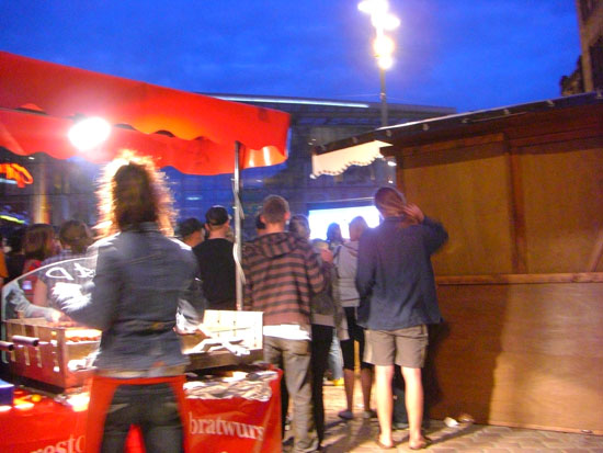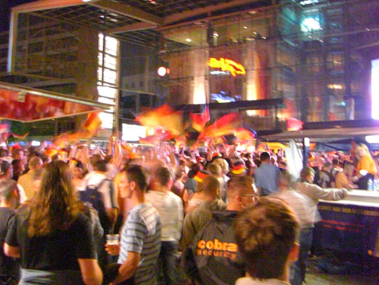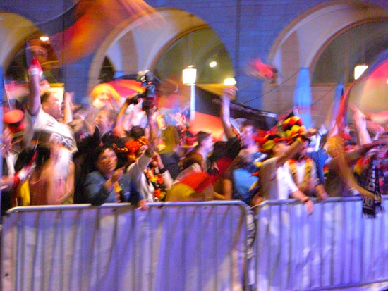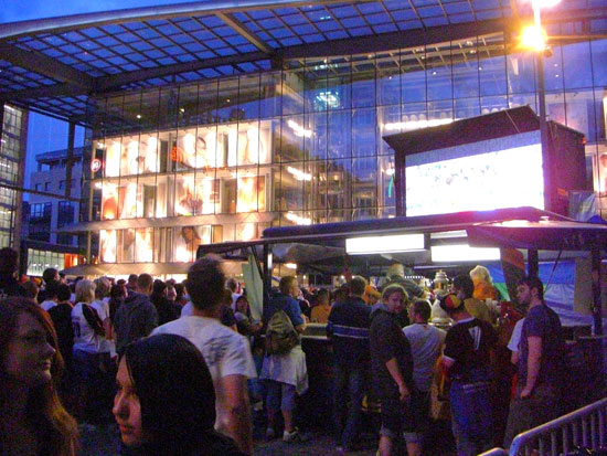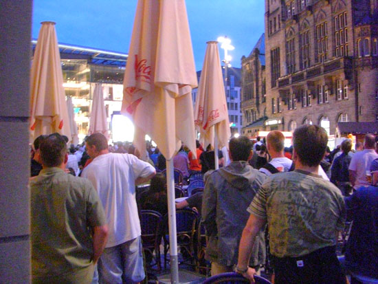 Zur zweiten Halbzeit war ich auf dem Markt zum „Public Viewing“ des Protugal Spiels. Schon in der ersten Halbzeit fielen zwei Tore für Deutschland. Die zweite war auch cool. Ich aß ’ne Bratwurst und guckte das super Spiel.