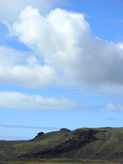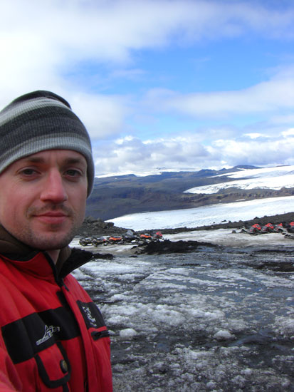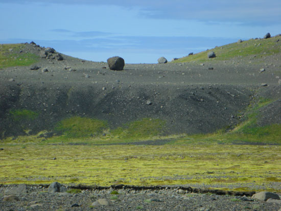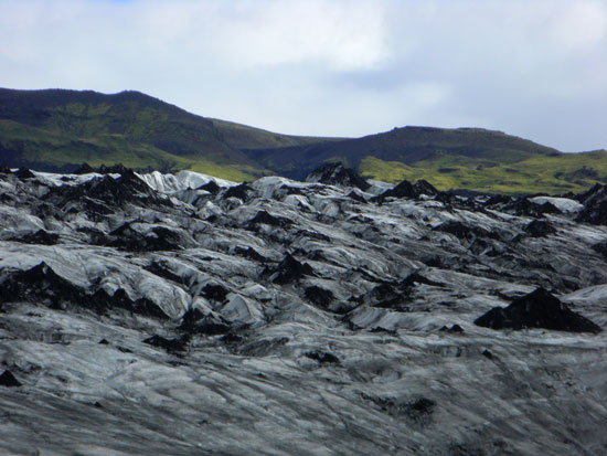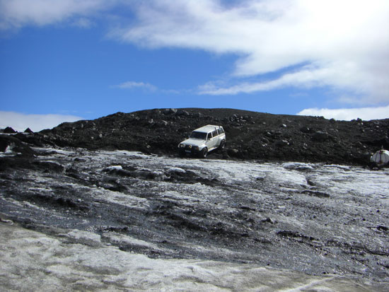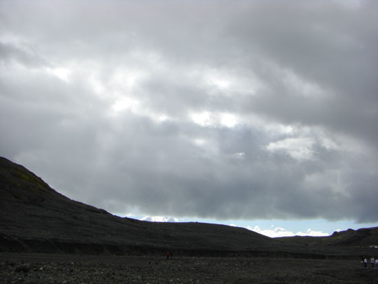Der erste Stopp war ’ne Tanke, wo ich mir noch ’nen Hot Dog kaufte. Dann ging es weiter in den südlichen Teil der Insel mit einer imposanten Landschaft. Die erste Gruppe, die auf dem Mýrdalsjökull Gletscher wandern wollte, wurde abgesetzt. Für den Rest ging’s noch eine halbe Stunde weiter. Die Zufahrten zum Gletscher sind nur Schotterpiste. Im Bus wackelte es gewaltig.