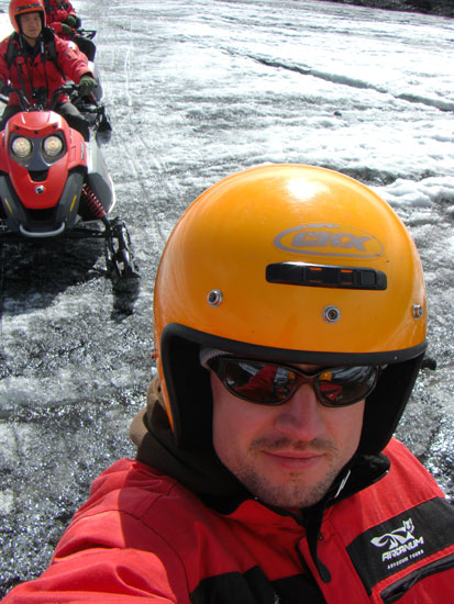 Wir bekamen Overalls, Helme und Schuhe und Handschuhe. Man hatte die Option, dass man statt 2 Mann auf einem Schneemobil auch ein einzelnes bekommt. Ich wollte filmen und insgeheim war mir das die ISM 7000 auch nicht wert. Ein großer Offroad-Bus brachte uns zu den Schneemobilen. Kurze Einweisung und es ging los. Ich war das erste Mal auf so einem Teil und es machte richtig Spaß. Die Sicht aufm Gletscher war nicht so gut, weil die Wolken heute tief hangen. Man sah dadurch jedoch oben ausschließlich Eis und Himmel. Super cool.