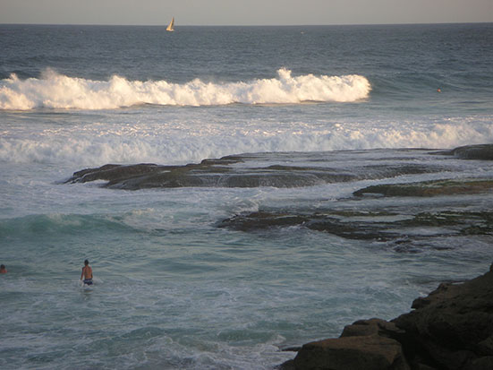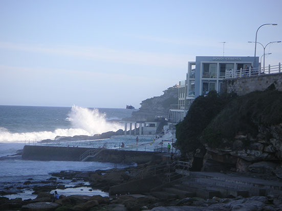 Auf nach Bondi. Das Wetter war erste Sahne. Ich wollte noch ein Touristen T-Shirt von der bekanntesten Syndey Beach. Ich holte einen Saft, den fetzigen Fetzen und ging dann der Nase nach Richtung Süden. Die Wellen waren heute richtige Kracher. Als Boogie-Board-Möchtegern-Surfer juckte es im Zeh. Da hätte man heute einige Stunts zaubern können. Die richtigen Surfer machten aber bessere Sachen.