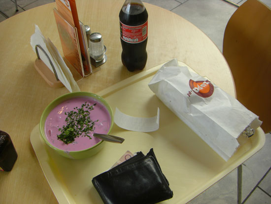 Erst mal holte ich ein paar Bus-Tickets, die kann man immer gebrauchen. Dann spazierte ich in die falsche Richtung und dann Richtung zur Mall für ein Mittagessen. Der maxikanische Burrito war sehr dilletantisch gefaltet und die kalte Yoghurtsuppe war auch mal was Neues. Bei Carrefour kaufte ich „Specijal“ Bier ein, was von einem anderen Polen empfohlen wurde. Ich spazierte weiter, mit Einkaufstasche zum Büro und war wieder erst gegen 16:30 dort. Schwitzend aber endlich da. Das Bier kam gut an. Café und Kuchen schmeckten dazu irgendwie auch. Ich plapperte wieder viel, vielleicht zu viel.