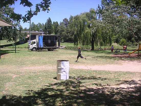 So ging es los. Der Rest der Truppe hatte ausgeschlafen und wartete bereits. Ich konnte mich gut unterhalten, die Fahrt war nicht langweilig. Beim Stopp in der Mittagspause in Inverell fand gerade ein Dorffest statt. In einem LKW sang eine Frau irgendwas daher. Das war ein trauriges Schauspiel. Niemand stand in der Nähe oder interessierte sich dafür. Dorf-Karaoke. Ein paar von uns drehten das Glücksrad. Zuckerwatte konnte man mir nicht aufschwatzen. Auf dem Flohmarkt hatten die Britten gute Schnäppchen gemacht. Hut und Kissen für ’nen Dollar. Sweet. Wir holten uns auch Sombreros, die am Abend getragen werden sollten. Die Oz Experience sollte in Byron erkannt werden.