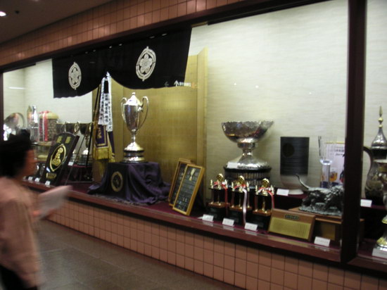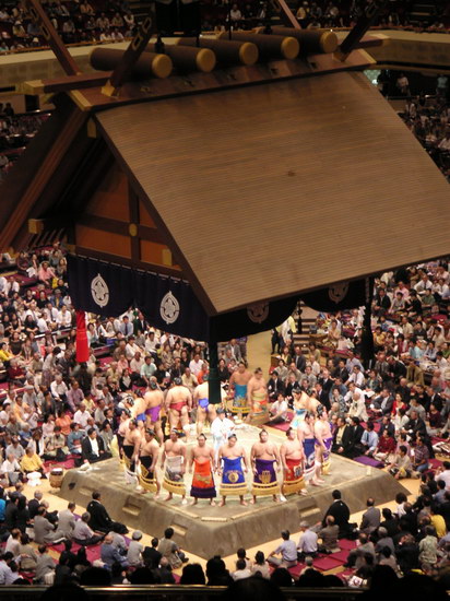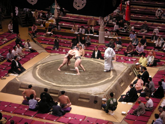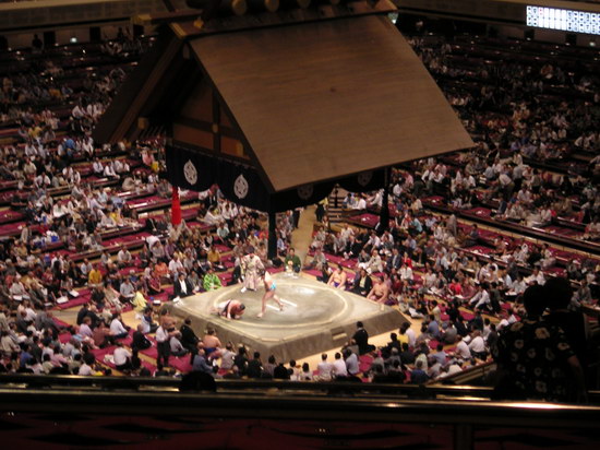 Vor der Halle wehten bunte Fahnen und ich bemerkte eine beachtliche Menschenmenge die eine Gasse für die ankommenden Sumos bildeten. Da gab es wohl schon die ersten verrückten Fans und ein Polizist musste doch bissel für Ordnung sorgen. Manch einer kam auch nur mit Taxi und hatte keine Fans. Ich holte mir ein Ticket, bekam einen Haufen Papier mit Sumo Infos und setzte mich erst mal in in die Halle. Es fanden Mittags nur die Vorkämpfe statt, mit Anfängern, die noch nicht ganz so dick und stark sind. Dann holte ich mir einen Imbiss für meine Körperfülle wobei sich die Halle auch immer mehr füllte.