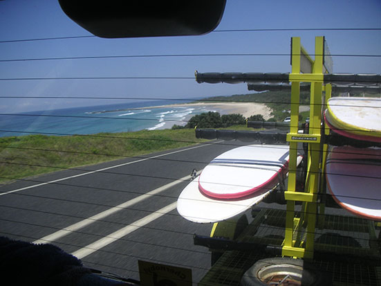 Draussen setzte ich mich vo die Tür. nach und nach wurden die Wartenden da abgeholt. Skydiving kann man hier auch machen. Der Minibus mit der Surfern kam dann an. Der Fahrer und Surflehrer war so, wie man sich das vorstellt. Es saßen schon 3 Leute im Bus, die gestern ihre erste Lektion hatten. Dann holten wir noch eine Koreanerin ab. Die Strände abseits von Byron waren wieder wunderschön. Jetzt am morgen waren noch nicht allzu viele Leute draussen. Die Wellen und das perfekte Wetter brachten ideale Bedingungen an Sharpes Beach. Wir bekamen Sonnencreme und auch die Shirts und Boards. Ich hatte eins in Pink aber naja…bei der ersten Stunde werde ich sowieso nicht so cool aussehen.