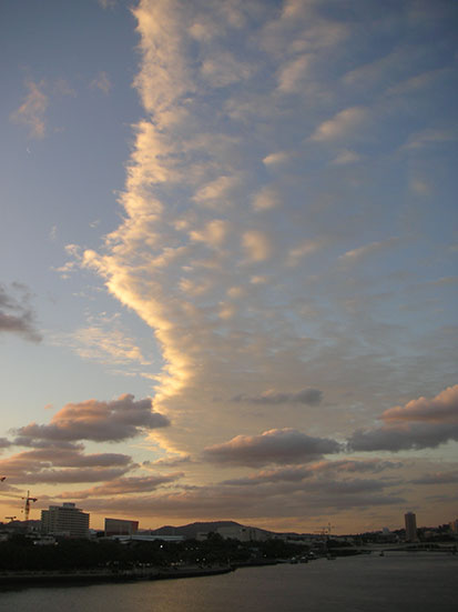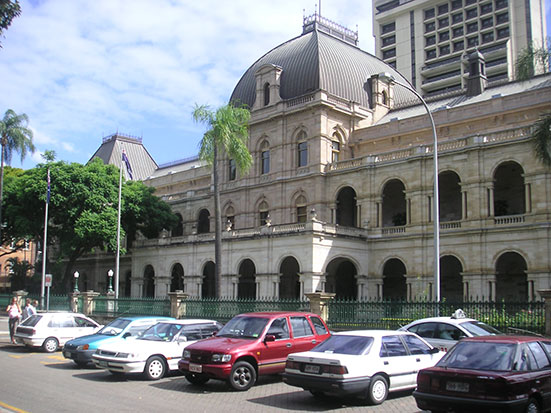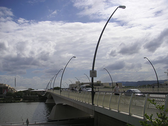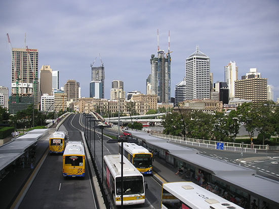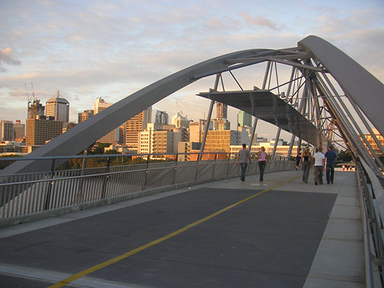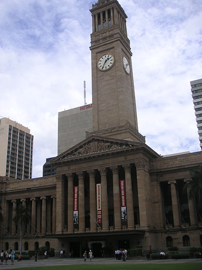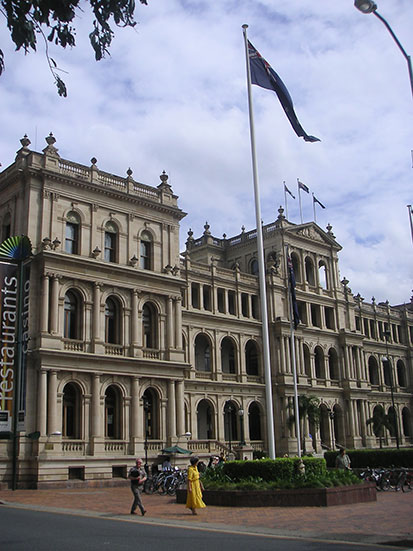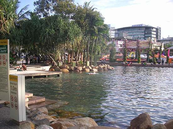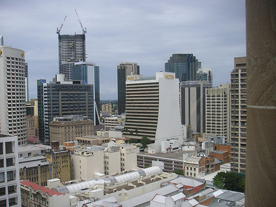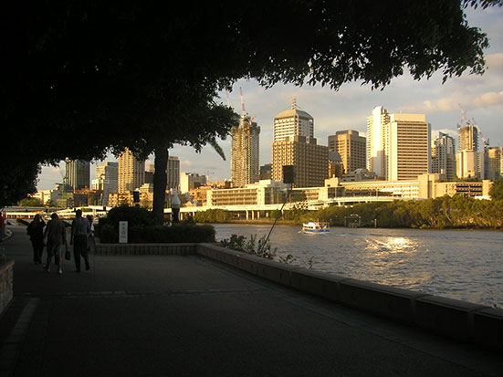 Runter zur Queen Street, an der technischen Uni vorbei über die Victoria Bridge. Schon ist man in der Southbank. Man sieht Brisbanes Skyline, an der gerade viel gebaut wird. Alt und neu wird oft gemischt.