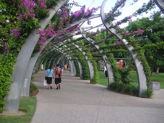 Ich ging den Weg im Southbank Park weiter. Vieles hier in Brisbane ist fein herausgeputzt. Da gibt’s an den meisten Ecken kleine Kust und einfach nette Sachen. So steht noch eine Pagode der Expo 1988 herum – inmitten eines dichten Regenwalds und dem Sound der vielen Grillen und Vögel.