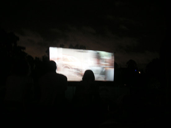 Das „Good Vibrations“ Konzert war mit AU$50 zweite Wahl – ich stolperte an einem Freiluft Kino vorbei. Was läuft? „I love Huckabees“ – kenne ich nicht…“with Mark Walberg“. Weiß ja nicht, ob das gut wird :-) ich nahm die Karte. Der Film war lustig und genau das Richtige. Die Mücken fanden mich auch super. Über dem Wald kreisten die „Flying Foxes“. Das sind riesige Fledermäuse, die ich schon aus Sydney kannte. War eine coole Stimmung. Mit einem Vampirfilm sicherlich unschlagbar. Witziger Film übers Leben an sich…