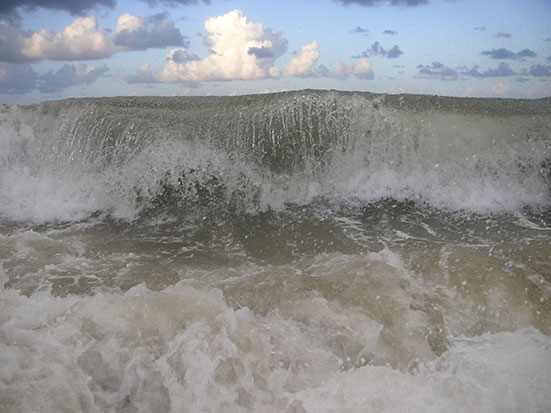 Wow, was waren das denn für Wellen?! Im Wasser waren das die höchsten, die ich selbst erlebte. Einmal war ich ca. 2-3 Meter auf einer, strampelte mit meinem Mini-Board und fiel dann von oben runter. Uaah! Da hatte ich mal Schiss, als dann das ganze Wasser auf mich drauffiel. Finster. War aber etwas locker. Keine neuen Schrammen, nur im Rücken merke ich noch die Crashs. Es gab noch mehrere Schleudergänge und die Power war schon beeindruckend. Cool.