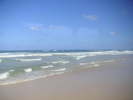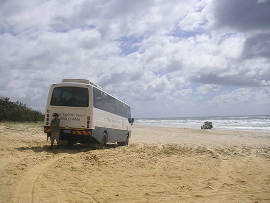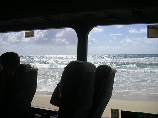 Es gab noch einen anderen Stopp bei rotem Sand. Die Fahrt auf der Beach war cool. Neben einem der Ozean, mit Speed durch die Bäche. Ein 4WD überholte uns auf Meeresseite und spritzte das Wassen uffn Bus. Der Guide und Fahrer war da nicht gerade happy drüber. Das Salz klebte dann die Fenster zu. Wenig später hatten die gleichen Leute einen Motorschaden und wir nahmen sie mit zur nächsten Telefonstation. So kann’s gehen. Nicht im Salzwasser fahren.
