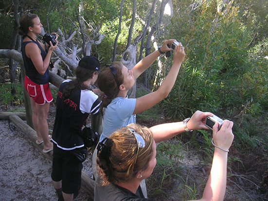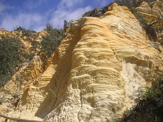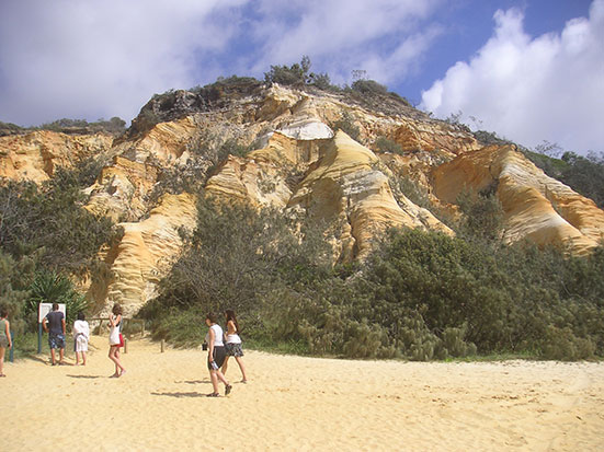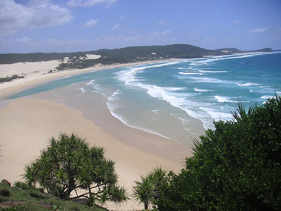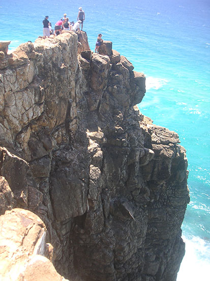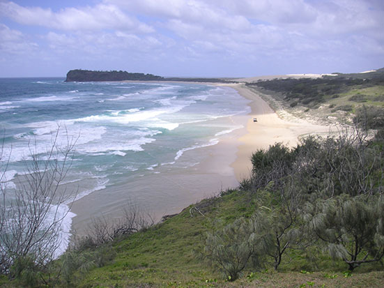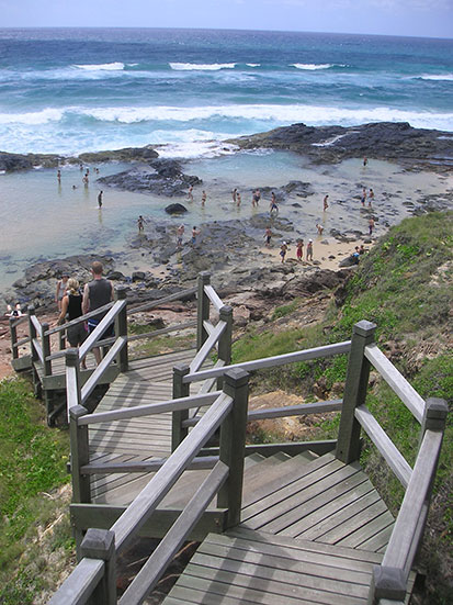 Mittagessen gab’s am Indian Head – Chicken Wraps. Von dem Fels begrüßten einst die Aboriginies (damals noch Indians) Käpt’n Cook. Wir stiegen da natürlich rauf. Wieder eine phantastische Aussicht. Mit den steilen Felswänden musste man natürlich aufpassen. Ich saß dann mit ein paar anderen noch an einer Wand und schaute den impossanten Wellen zu. Haie sah ich keine, ein paar Rochen schwebten aber im Wasser herum. Ich ging wieder runter und lief noch im seichten Wasser herum. Hier sollte man maximal Knietief ins Wasser gehen, damit man bei Haien noch rennen kann. Die Strömung war auch nicht ohne. Ein Adler flog an mir vorbei. Wie die anderen berichteten, aß er seinen Fisch genau unter ihrer Aussichtsstelle.