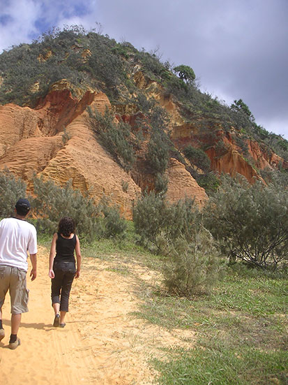 Ein erster Stopp waren Coloured Sands. Da gab’s eine Aboriginie Geschichte dazu. Ein Mädel wurde einem Mann verspreochen, der alt war aber gut mit dem Bumerang. Sie liebte einen anderen, den Regenbogen. Der alte warf den Bumerang auf das Mädel, der Regenbogen stellte sich zum Schutz in den Weg und zerschmetterte in tausend Stücke. Die Regenbogenfarben sieht man daher nun im Sand.