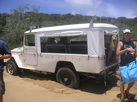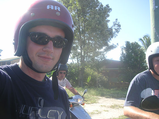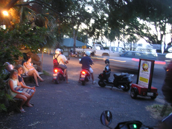 Um 11:00 startete eine kostenlose Tour durch die Gegend. Mit Jeeps ging es ganz krass durch den Wald und Hügelpisten an einen komplett leeren Strand. Feine Aussicht und bissel Werbung für die Scooter-Roo Tour, von der ich auch nur Gutes gehört hatte. Der Eigentümer da ist ein Alt-Rocker. Ihn kann ich mir schlecht auf ’nem Motoroller vorstellen aber ich wollte das machen. Vorbei am See-Kayak, hätte ich auch gern gemacht nur 12:30 – 15:00 und ab 15:30 Scooter? Da muss ich irgendwann ja auch mal was essen.