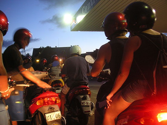 Im Hostel schnell geduscht und dann zur anderen Straßenseite zu den Rollern. Die meisten hatten schon ihren Helm und saßen aufm Roller. Jeder bekam eine kurze Einweisung, war aber megasimple, da die Roller mit Automatik waren. Nur Gas und Bremsen. Das machte schon die Testrunde Megaspaß und dann setzte sich der Konvoy in Bewegung. So um die 20 Motoroller machten eine gute Show.