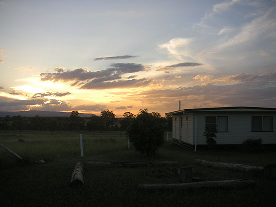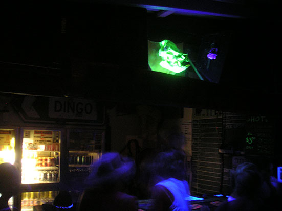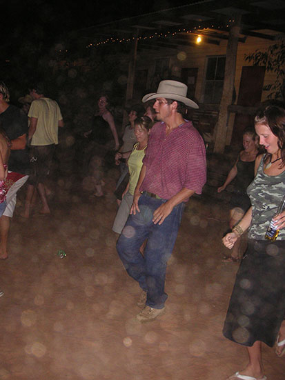 Auf der Farm waren ein paar Baracken. Dusche und dann Abendessen aus Blechgeschirr. Alles war cool, nur das Bier zu teuer. AU$4 für die Dose ist schon heftig. Der Abend wurde witzig. Im roten Wüstensand versuchten wir Line-Dance. Da stolperten alle herum, während die Cowboys vorsteppten und ihren Spaß hatten. Trallala! Weiter wurde auf den Tischen getanzt. Super Zeit, irgendwo weit draussen im Buschland.