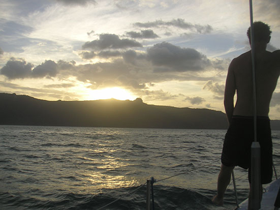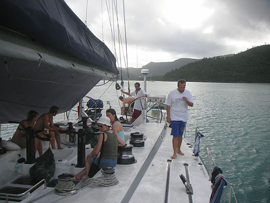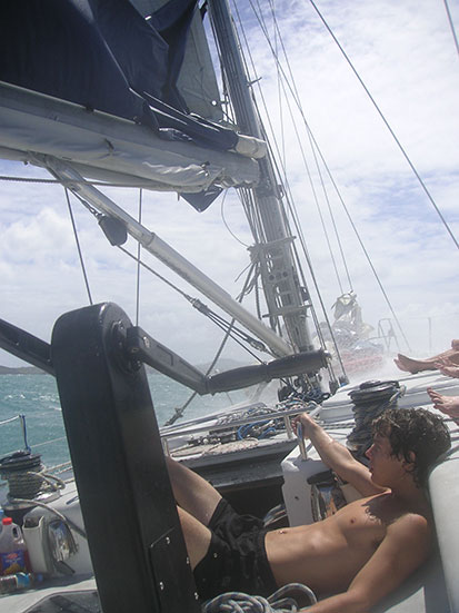 Aufgewacht nach Sonnenaufgang. Das Wetter war nicht mehr so sonnig. Wir waren auf neuem Kurs. Die Wellen wurden richtig groß und Regen flog auch noch herum. So macht das Spaß. Alle in Regenmänteln. Das Hauptsegel wurde gesetzt. Der hohe Wellengang brachte fast Airtime. Eine ging fast über Bord. Vordersegel auch noch hoch und dann den Wind greifen.