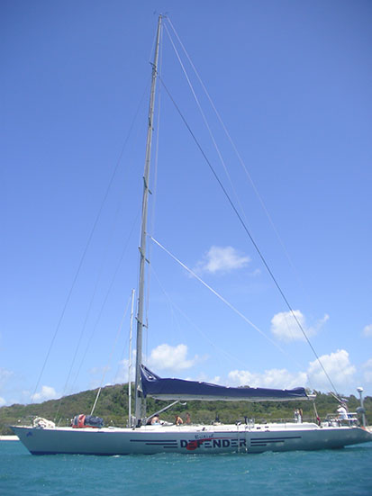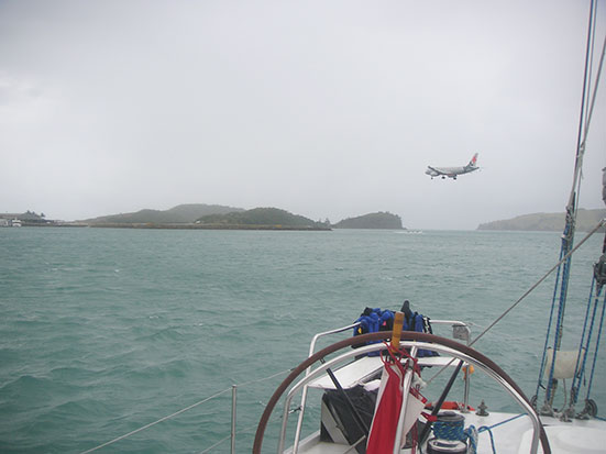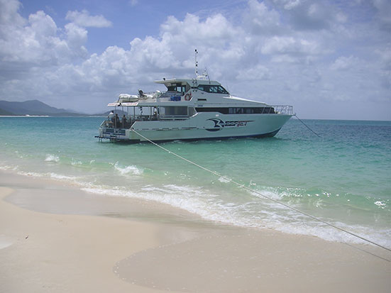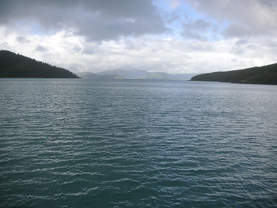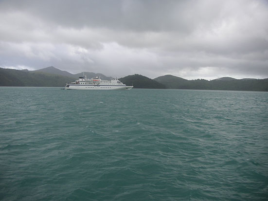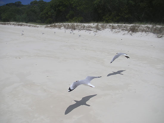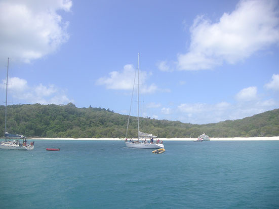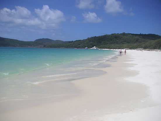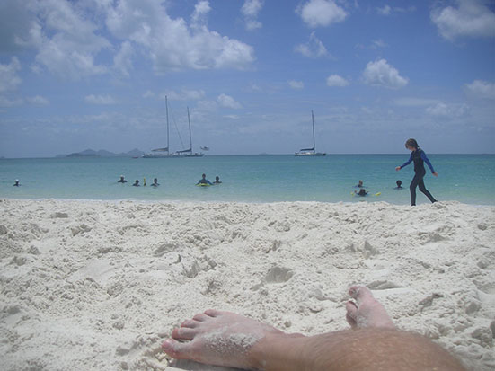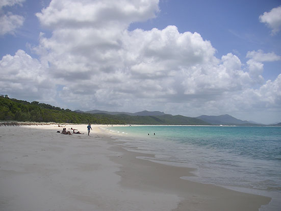 Auch mit einem Segel ging’s gut vorwärts in besseres Wetter. Irgendwie verpasste ich die Ankündigung nach Whitehaven Beach. So hatte ich den Stinger Suit nicht mit dabei und schnappte gerade noch mein Handtuch für die Abfahrt. Nur wenige blieben an Bord. Dann landeten wir an einem der reinsten Sandstrände. Fast 100% reines Silica, angeblich 10 Tonnen davon im Hubble-Teleskop. Während es vor vor kurzem noch kaltes wildes Wetter gab, bruzelte die Sonne am Strand megaheiß. Ich konnte nicht ins Wasser, bugger. Nach einer Weile dumm herumliegen, lief ich ein Stückchen. Nach der Rückkehr machte ich ein paar witzige Ninja-Photos für die anderen. Dann wieder zurück aufs Boot. Ich hatte bissel schlechte Laune, fand aber alles ganz gut. Langsam kenne ich Strände. Der hier war auch super, wie alle.
