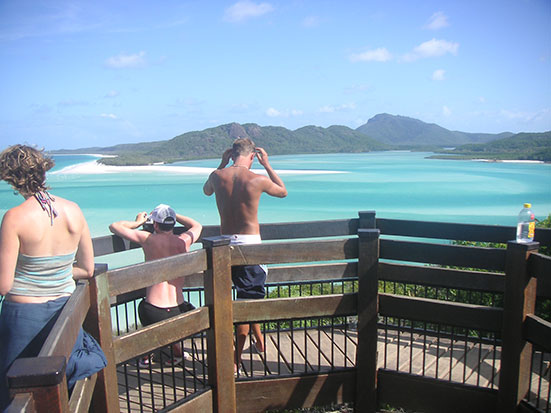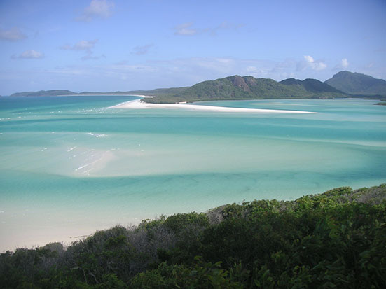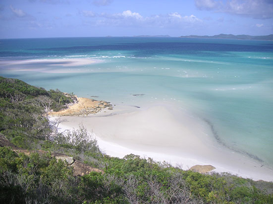 Wir landeten an einem Strand und liefen hoch zu einem Aussichtspunkt. Da sah man einen weißen Sandstreifen ins Meer hineinragen. Das Bild schlechthin für die Whitsundays.