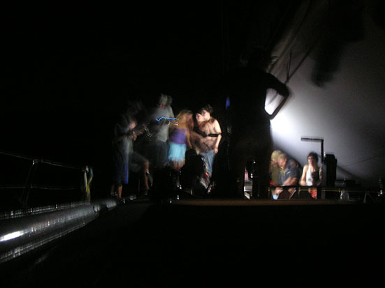 Ich war auch mit an den Grinders und rackerte mit. Der heftige Wind machten die letzten paar Umdrehungen ganz schön schwer. Alle legten sich ins Zeug…nur noch ein bisschen und…PENG! Auf einmal war das Seil am Vordersegel abgerissen. Das Segel flatterte wild herum. Hui! Der Matrose flog hin und holte es schnell ein. Das war hin. So einen Ring aus dem Segel zu reißen, kommt sicherlich nicht so oft vor. Nun hatten wir’s kaputt gemacht, Materialermüdung.