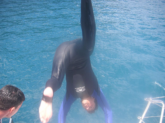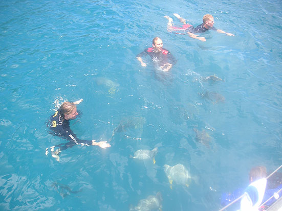 Zum letzten Schnorcheln vor dem Mittagessen waren auch alle dabei. Unter Wasser war diese Gegend das Beste. Viele bunte Fische und ein gigantischer großer Fish. Ein Scuba-Diver hatte eine Unterwasserkamera und Essen-Flasche dabei. Er fütterte den großen Fisch während ein ganzer Schwarm hinterherzog. Unglaublich. Als das Riesenvieh auf mich zugeschwommen kam, hatte ich schon bissel Bammel. Der hatte zwar keine Zähne und sah sehr lieb aus, war aber eben groß — über 1 Meter schon. Ich sah sogar ein paar kleine Clown-Fische aus Findet Nemo. So süß!!