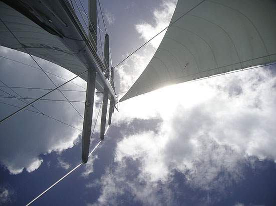 Ich zog das Vordersegel hoch, Unterstützung brauchte ich da auch. Wir hatten einen gewichtigen Passagier an Bord aber beim Vordersegel half er leider nicht. Also mussten wir die Muskeln spielen lassen. Hey!