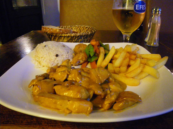 Abends schaute ich mich etwas in der Gegend um und hatte ein „Chicken Curry“ im Sofa Café. Es gab Schneeregen. Relativ zeitig ins Bett. Sehr kalt im Zimmer.