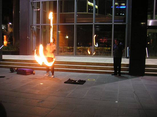 In der Nacht wollte ich auf ’ne Party. Immer noch nicht 100%ig fit schaute ich auf der Southbank ein paar Straßenkünstlern zu. Die Party fand ich nicht aber dort gab’s auch Unterhaltung. Einer Feuerjongleur war wohl wirklich knapp bei Kasse, machte zwar eine coole Show — sogar mit Entfesselung. Klimpergeld hatte ich zu Hause gelassen. Cheap ass.