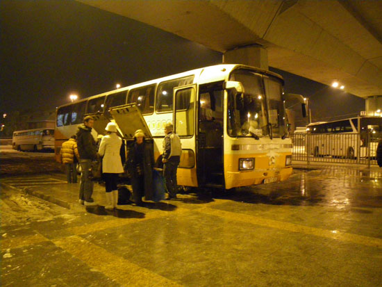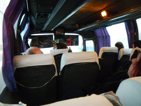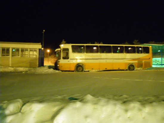 Die Verspätung war dann gut ’ne Stunde. Ich hörte heute einige Male „Europe: The Final Countdown“. Erst beim Frühstück und dann noch 12 Mal aufm Busbahnhof. Erinnerungen an Banana Bungalow in San Diego. Hier standen die ganze Zeit alle in der Kälte und warteten. Dann kam endlich der „TRANSKOP“ Bus. Sah alt aus. Einer regte sich dann heftig auf und legte sich mit dem Busfahrer an. Ich fand zufälligerweise meinen Sitzplatz. Kalte Luft an den Füßen aber ich kam zurecht. An der Grenze zwei Mal Kontrolle und ca. 22:30 in Skopje.