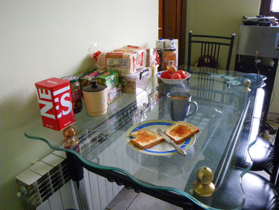 Ein paar Minuten später hörte ich jemanden kommen und hatte so mein Frühstück. Ich ließ ein Taxi rufen und kam mit Gepäck und Bettzeug wieder. Die restlcihen €3 zahlte ich in 180 Dinar. Dann suchte ich mein Handy und fand es nicht. Das Taxi war da, ich klingelte mein E61 aber beim „Meeting“-Profil gab es nur einen kleinen Piep. Es war nicht in meinen Sachn und ich schaute wieder unten in meinem Zimmer nach. Es piepte aber ich konnte es einfach nicht sehen. Das Mdel ausm Hostel suchte mit und sah es auf einem oberen Bett liegend. So was!