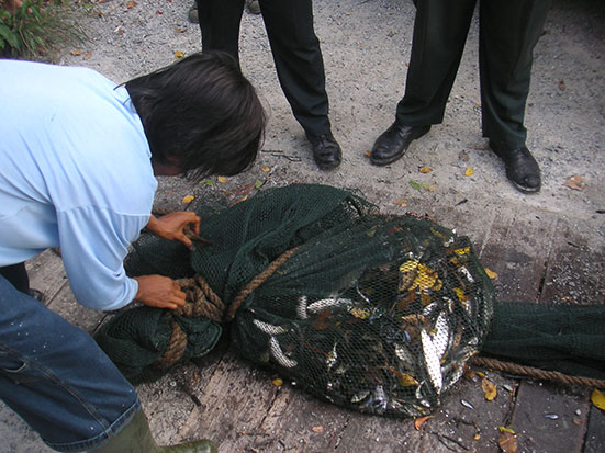 Man konnte sich hinter ein paar Sichtwänden postieren und von da die vielen Vögel beobachten. Ein paar Aussichtstürme geben besseren Überblick. Ich knipste ein paar Monitors (Echsen), die eine Kolumbianerin aus unserer Gruppe entdeckt hatte. Dann waren die anderen 4 weg und wir gingen in eine uns gewiesene Richtung. Wir fanden unsere Leute nicht mehr. Der Park ist überschaubar groß also schauten wir einfach so in der Gegend herum. Sie entdeckte ienen Otter (erfuhren wir später) und dann sahen wir, wie ein Fischnetz mit allerlei Wassertieren an Land gezogen wurde.