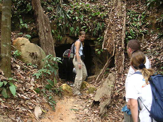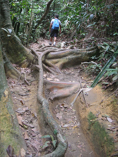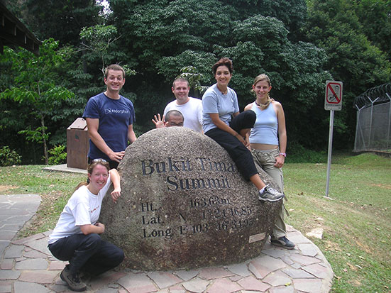 Es war schon Mittag also erst mal Essen. Es gab Ente und Chicken – auch gut. Dann stiegen wir auf den höchsten natürlichen Punkt Singapurs. Der Weg auf den Bukit Sima war steil und schön. Oben gab’s ein Gruppenbild und getrocknete Mangos aus meinem Rucksack. Zurück rollten wir einen anderen Weg vorbei. Ein paar alte Höhlen wurden zu Kriegszeiten als Verstecke vor den Japanern genutzt. Ich schwang mal an einer Liane und war dann auch froh, als wir wieder im Infocenter ankamen. Zwei Büchsen mit dem 100+ (Isodrink) und bissel Green Tea gingen runter wie Öl.