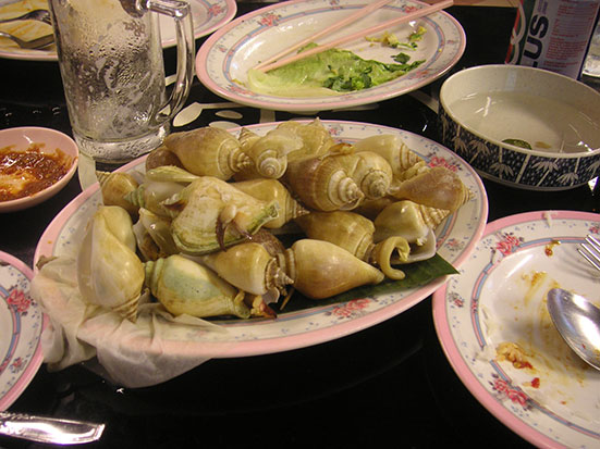 Erst mal fuhren wir weiter, setzten jemanden ab, gingen in eine Straßenkneipe. Iich bestellte mir Tshu Thsu (oder so). Der Kellner lachte herum, ich wusste nicht warum, wollte es aber haben. Dann kam er später zurücl — Tshu Tshu war aus. Also bestellte ich Gong Gong, auch ohne Ahnung, was das ist aber ich hatte Hunger. Dann kam ein Teller mit ’nem Berg Schnecken, scharfe Soße und ein paar Zahnstochern. Na da fragte ich natürlich gleich, wie man das isst. Mit dem Zahnstocher wurde in die Schnecke hereingepickst und dann konnte man das Fleisch herausfummeln. War lecker mit der Soße aber ich holte noch ’nen Teller Reis.