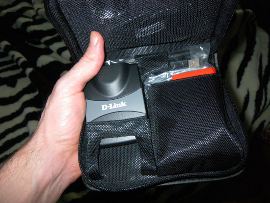 Ich installierte den D-Link DWL-G730AP Minirouter hier ans DSL. Das Teil kam mit einer schönen Tasche. Das Ding kann auch über USB Power laufen und macht einen mobilen AP, Client oder eben WLAN Router.